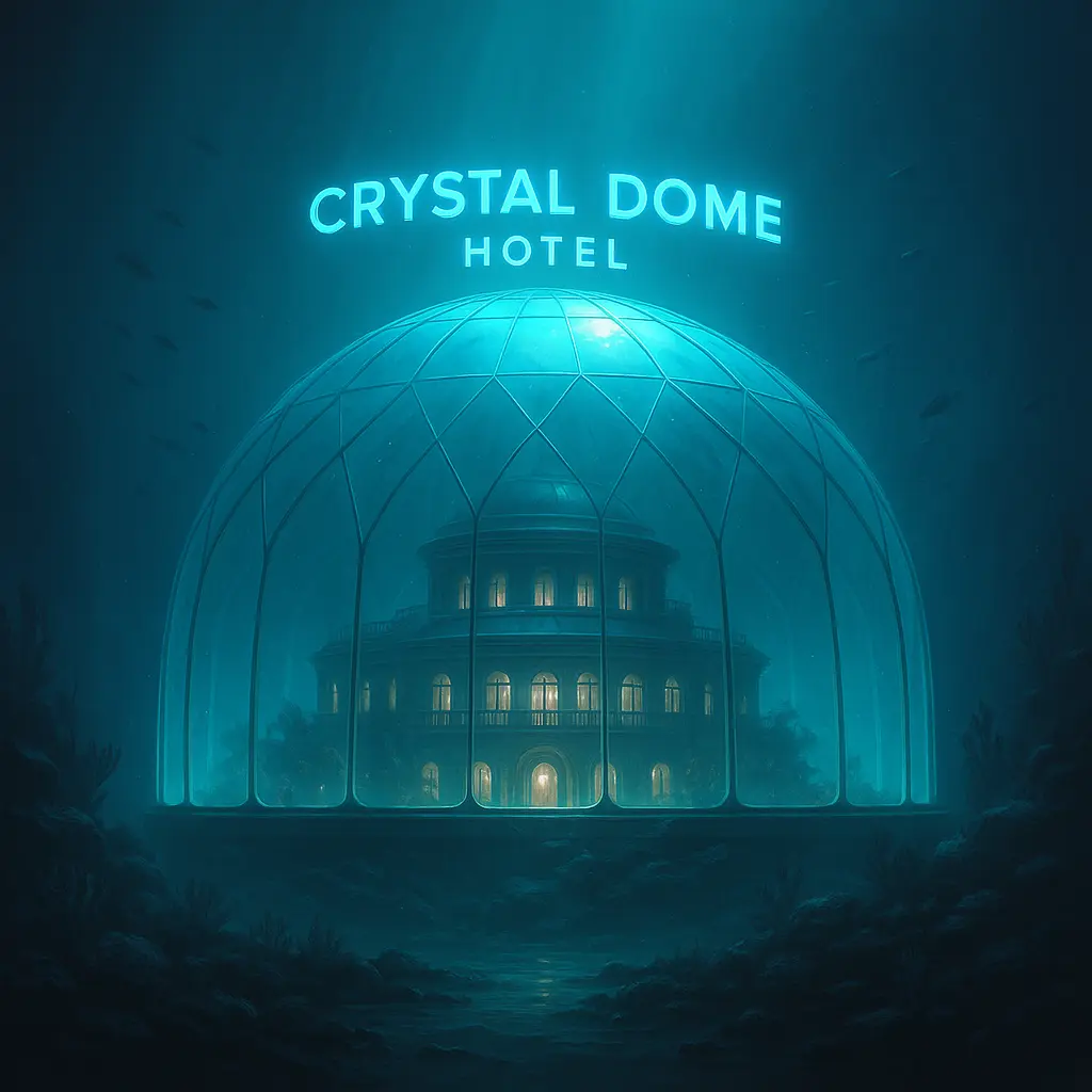 Sleep in a transparent crystal dome with a panoramic view of the underwater city and bioluminescent creatures.