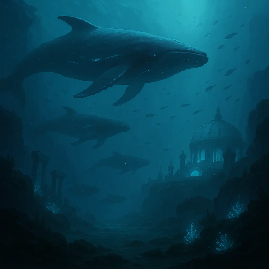 Watch the migration of giant deep-sea whales, illuminated by the crystal light of Atlantis.